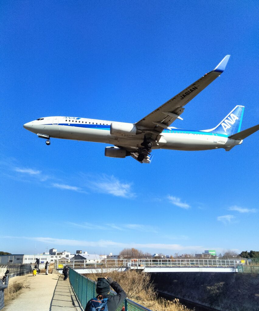 滑走路エンドの千里川土手は、頭の真上を通過して航空機が着陸する、大迫力の人気スポット!