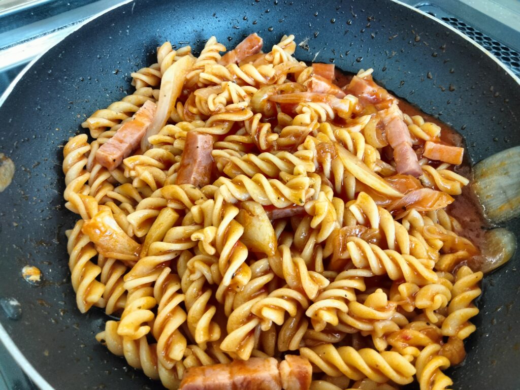 一品目はにんにくとベーコンと玉ねぎの入ったトマトソースのショートパスタ