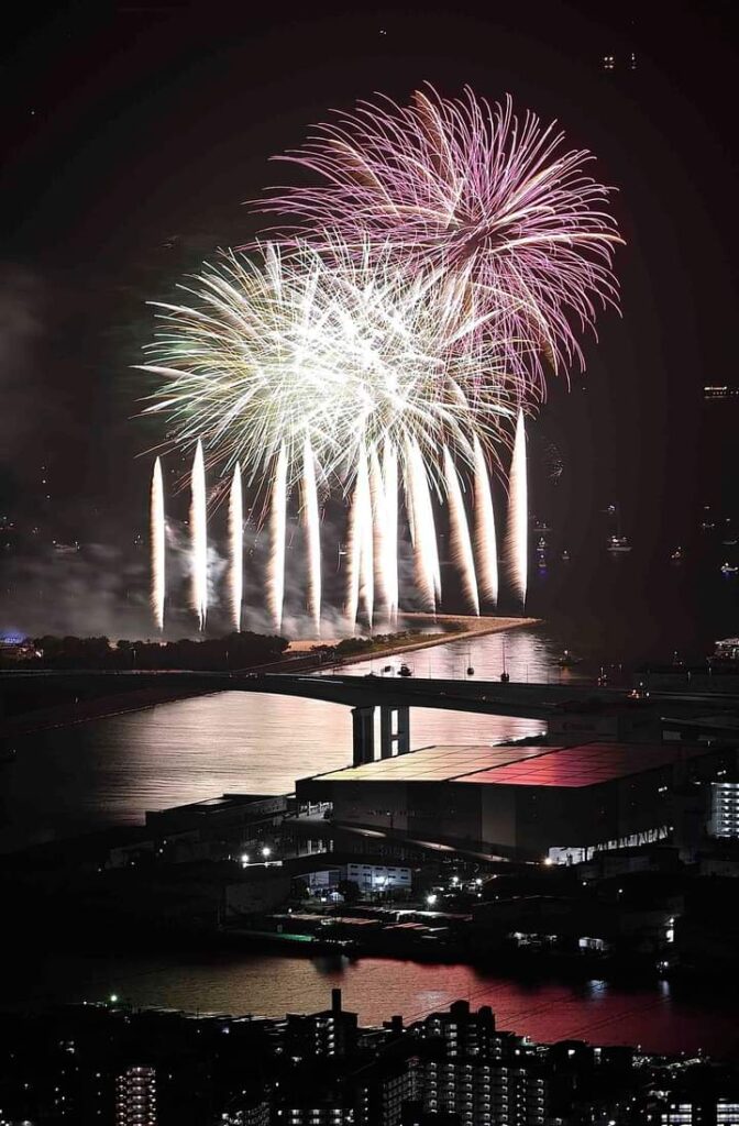 夏の夜空を彩る花火という表現がありますが、山の上から花火を見下ろしているので、1000万ドルの夜景の中に、儚い時間だけ開く、花が咲いているようです