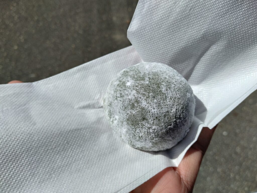皆さん揃って妙見宮鳥居横の名物の草餅「亥の子餅」に舌鼓