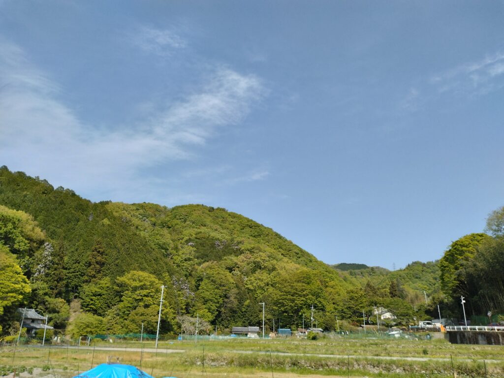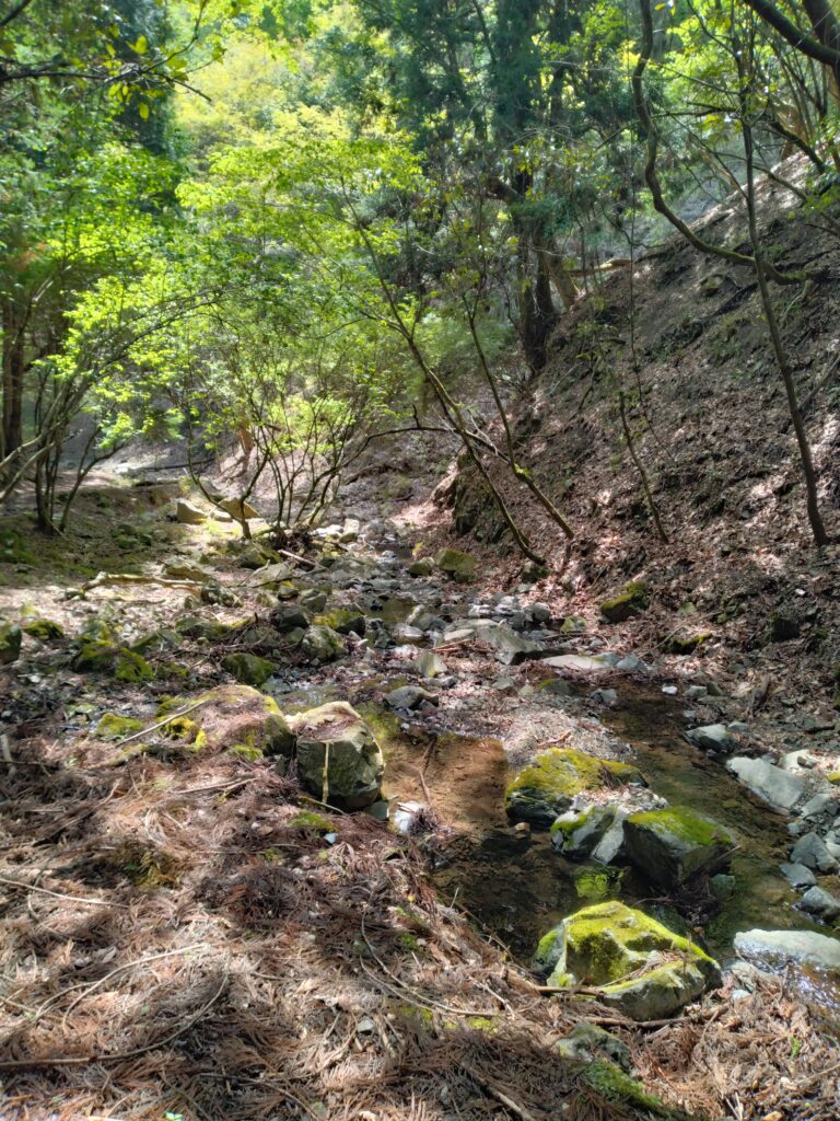 ここまで来るとあと少し初谷渓谷を抜けて、振り返れば新緑の美しい能勢妙見の山々が見えます