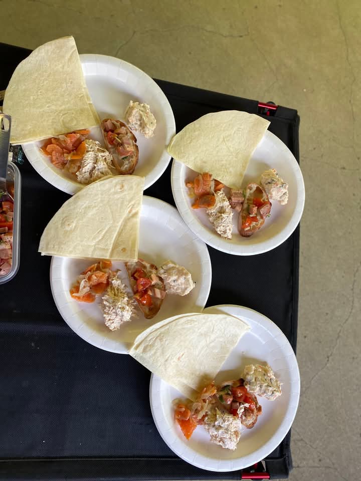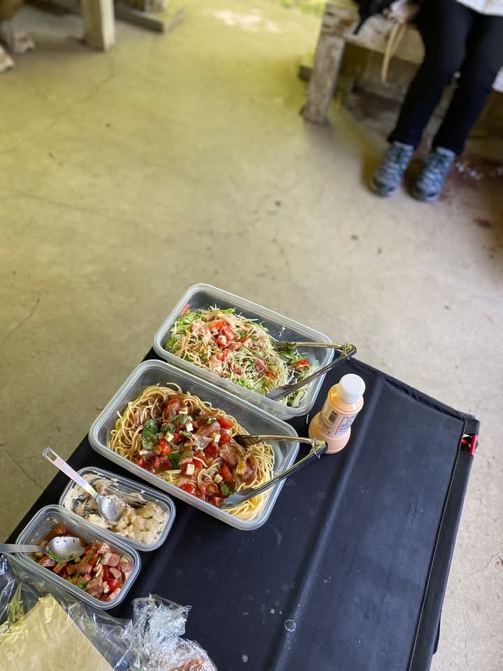 今日の山ごはんは、生ハムとトマトとバジルの冷製パスタ、野菜サラダ、オードブルがウイキョウ風味のサーモンマリネ、鴨のブルスケッタ、チキンのレモンペッパー風味、明太子ポテトサラダ