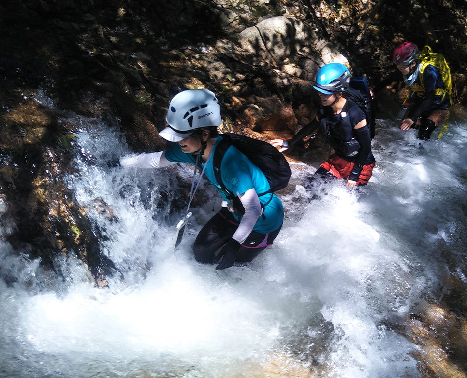 うだるような暑さも、沢の流れに足を浸せば爽やかな清涼の夏に。特別な装備なしで川を踏破し、幻の滝を目指すシャワークライミングです。登山初心者の方でもお気軽にご参加いただけます。